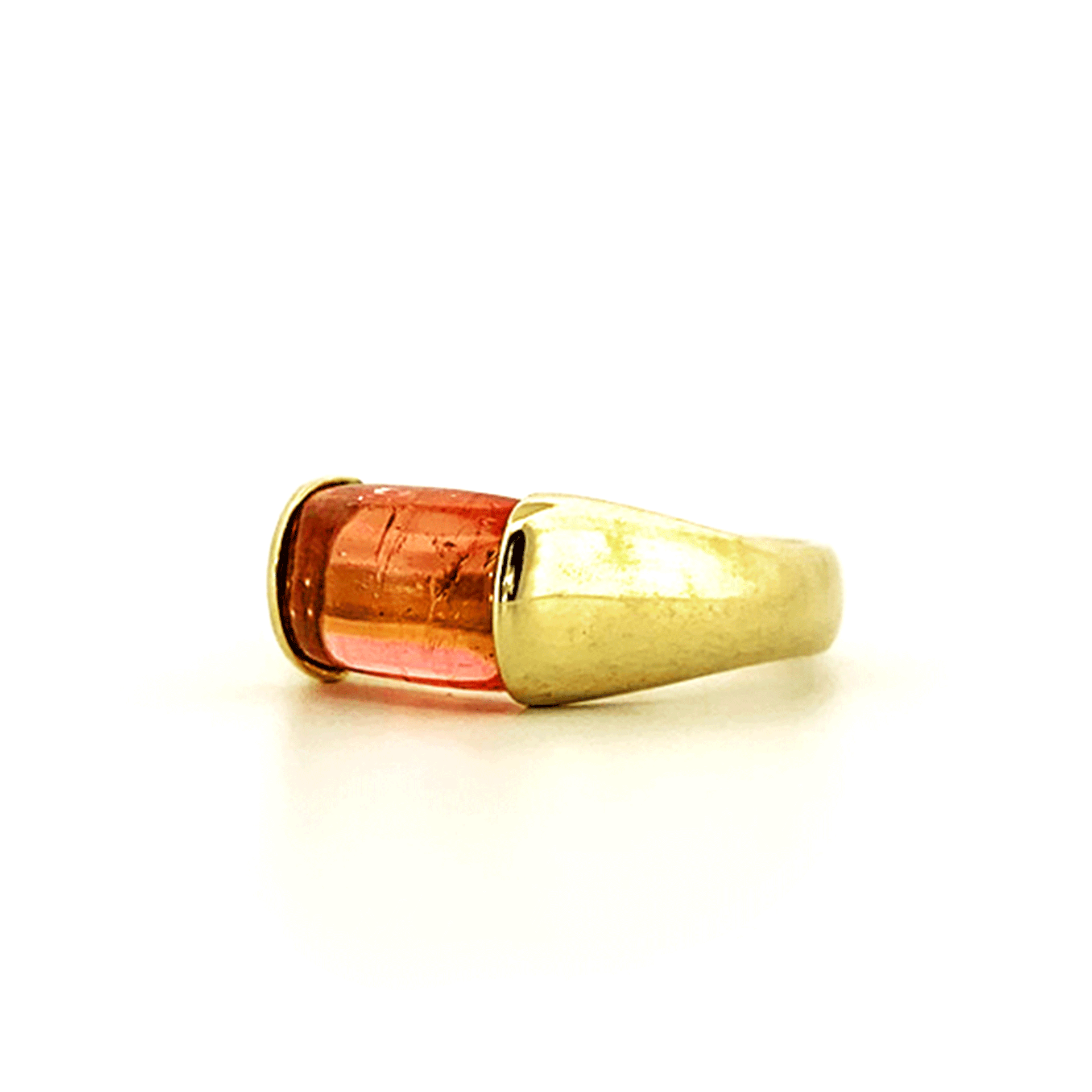 A light pink tourmaline with elongated, rounded shapes, subtly embraced by the setting. The 18-karat yellow gold ring follows the lines of the stone, translating them into a flowing, elegant whole.