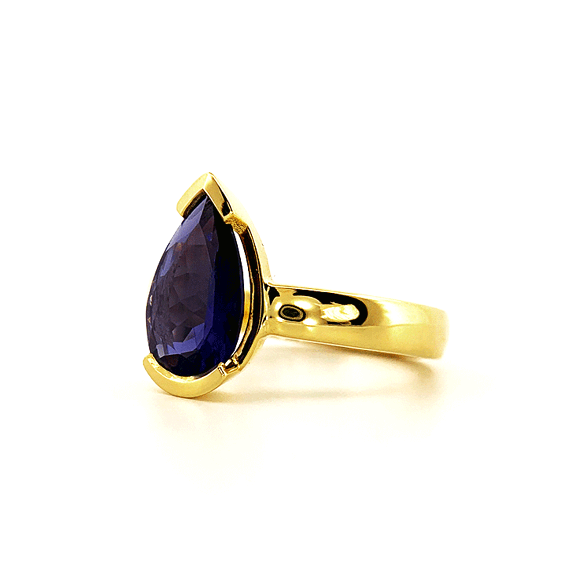 This iolite, cut into a delicate pear shape, catches the light, revealing deep blue-purple hues reminiscent of the evening sky. The subtle interplay of colors gives the ring a mysterious and timeless aura. A gemstone that combines elegance and character.