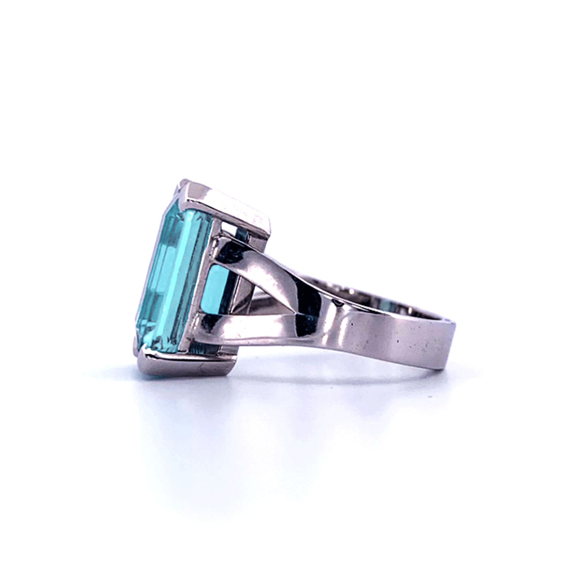 This emerald-cut aquamarine, with its soft blue-green glow, exudes tranquility and elegance. The stone is set in a sleek 18-karat white gold setting that emphasizes the natural shape of the aquamarine (beryl). A design that combines strength and serenity.