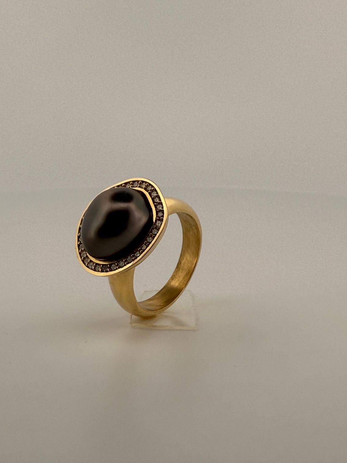 Dit juweel is werkelijk uniek. De Tahiti parel heeft een karakteristieke, natuurlijke vorm die subtiel terugkomt in de vormgeving van de zetting. De bovenrand is verfijnd afgewerkt met 32 briljant geslepen diamanten, pavé gezet voor een schitterend effect.