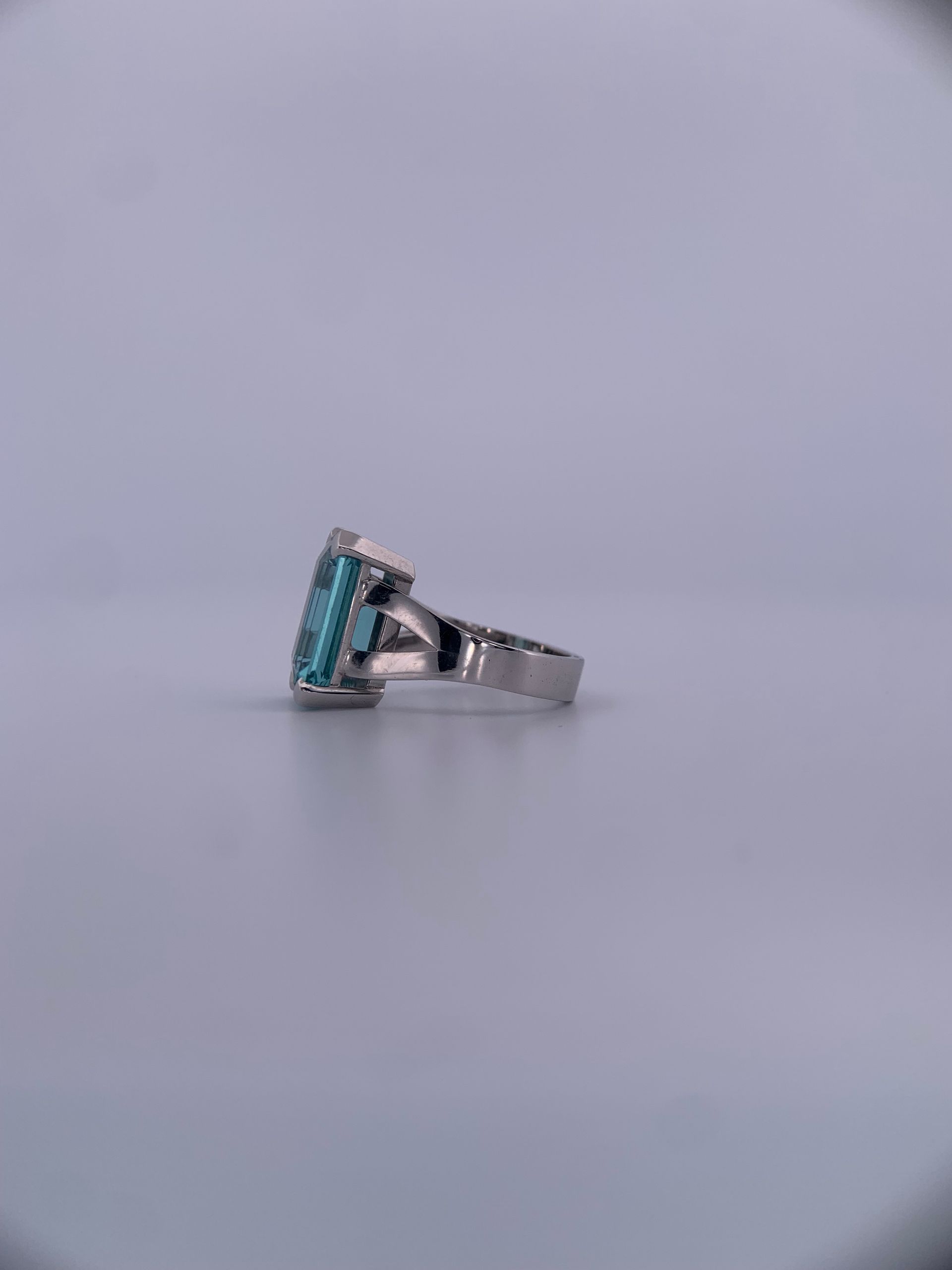 Deze smaragd geslepen Aquamarijn, met zijn zachte blauwgroene gloed, straalt rust en elegantie uit. De steen is gezet in een subtiele en strakke zetting, die de natuurlijke vorm van de Aquamarijn (Beryl) benadrukt. Een tijdloos ontwerp dat kracht en sereniteit verenigt.