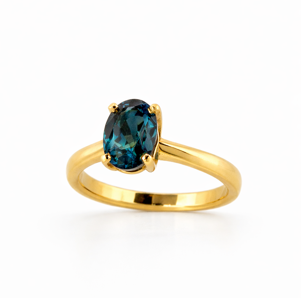 De blauwe topaas straalt met een koele, elegante glans die rust uitstraalt. De 18 karaat geelgouden zetting loopt spits toe, waardoor de sierlijke vorm van het ontwerp extra wordt benadrukt. Een juweel dat minimalisme en elegantie moeiteloos samenbrengt.