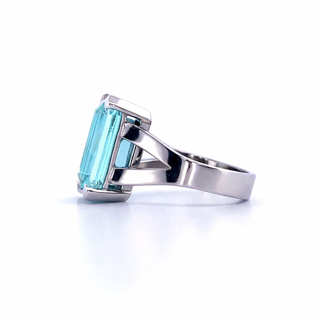 Deze smaragd geslepen Aquamarijn, met zijn zachte blauwgroene gloed, straalt rust en elegantie uit. De steen is gezet in een strakke 18 karaat witgouden zetting, die de natuurlijke vorm van de Aquamarijn (Beryl) benadrukt. Een ontwerp dat kracht en sereniteit verenigt.